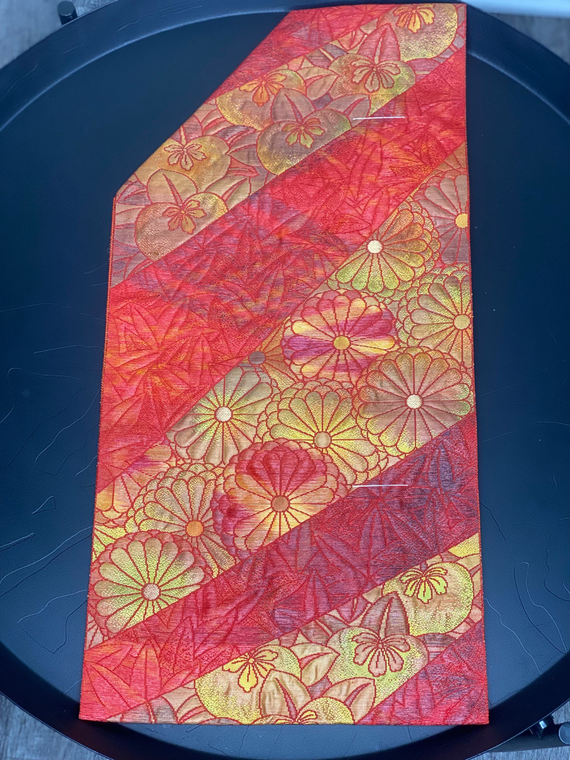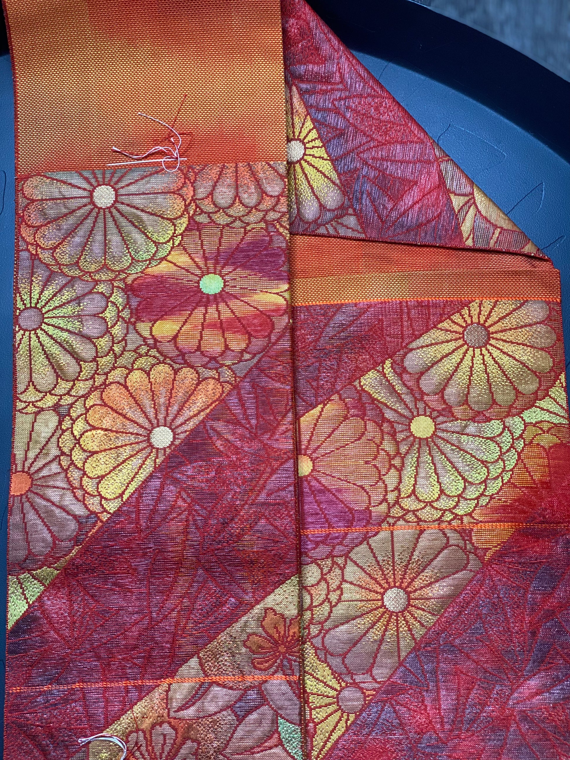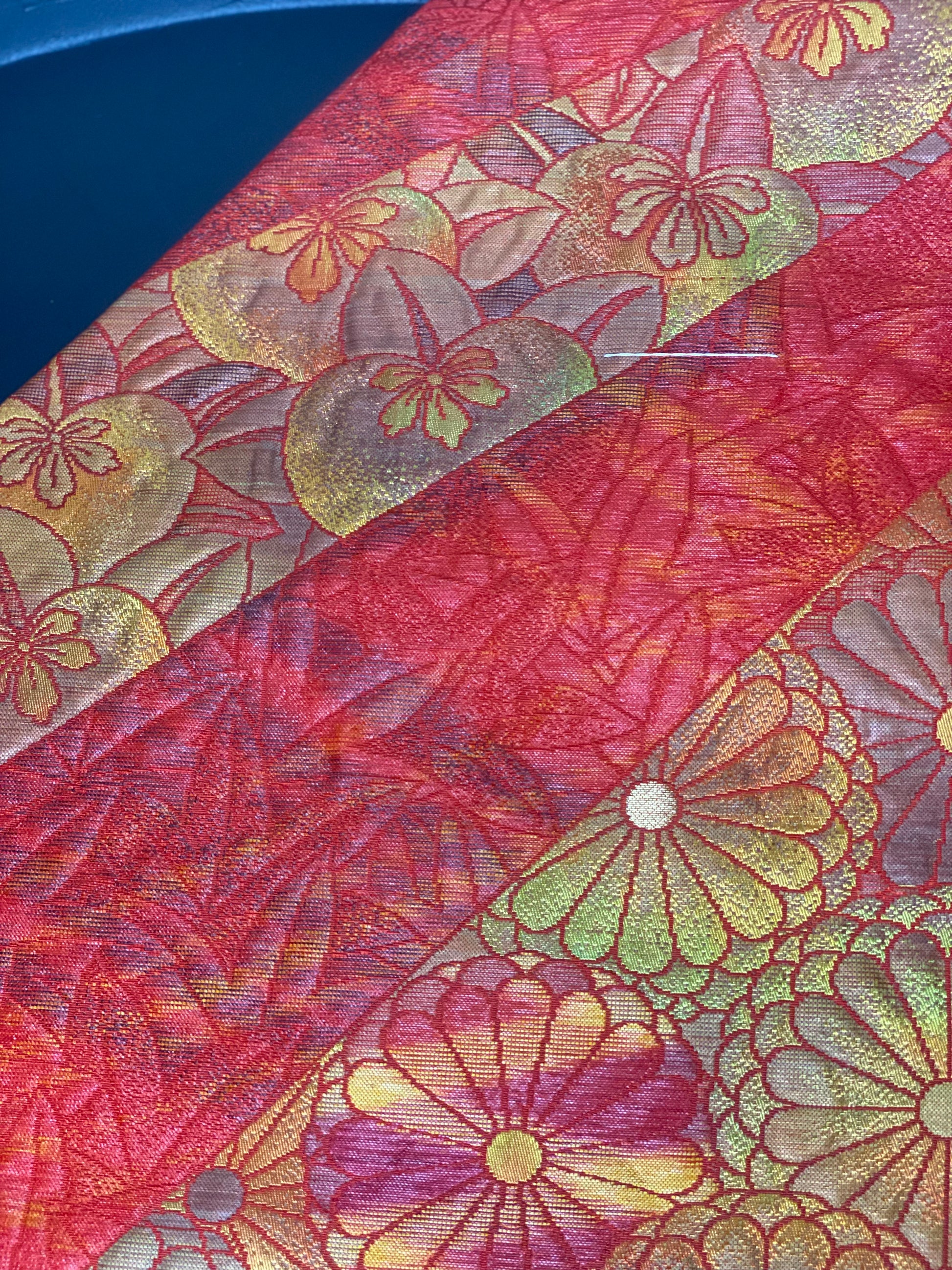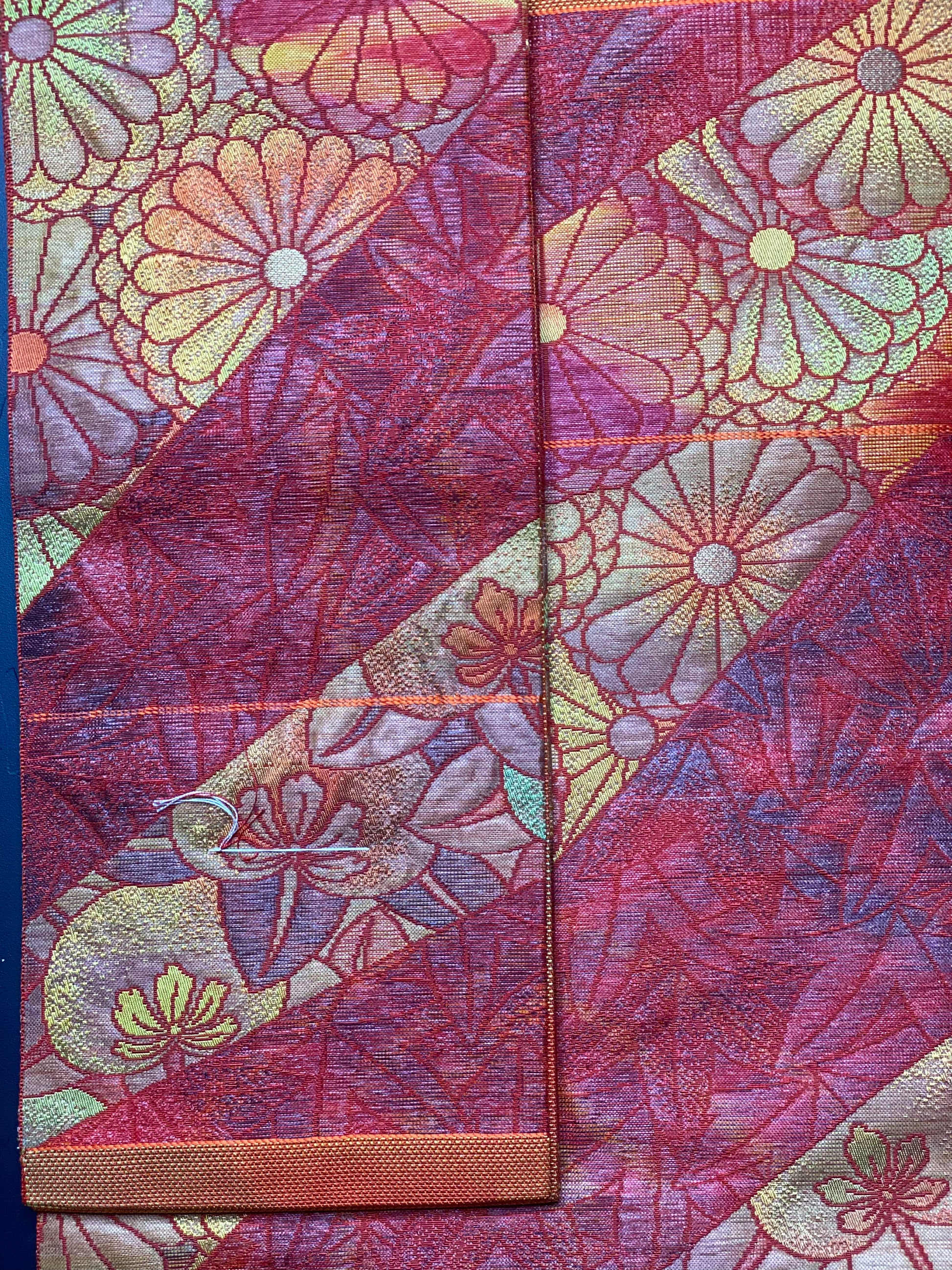This is a nagoya style obi. That means that one end has been folded in half and sewn shut to facilitate ease of wear. The opposite end is the full width of a traditional obi.
